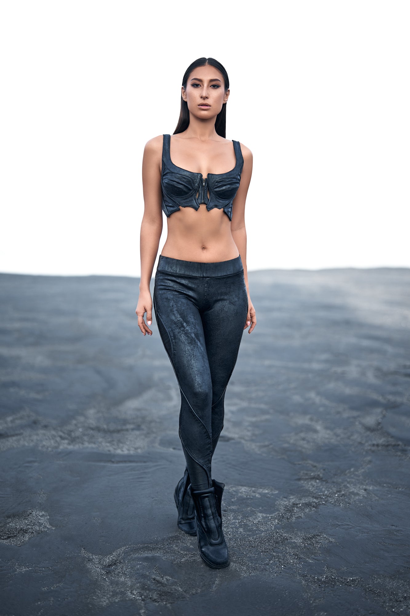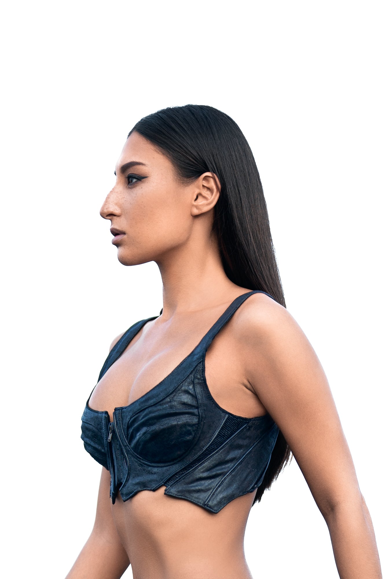 Gewachstes, strukturiertes Bustier-Crop-Top für Femme Fatales. Distressed Grunge-Textur. Sexy Korsett Panzer oben. Eingebaute Bügel und weiche Polsterung für zusätzlichen Halt. Satin-Innenfutter für seidigen Komfort. Normale Passform. Schultergurte. U-Ausschnitt. Endet knapp über der Taille. Reißverschlussöffnung vorne. Gerippte Einsätze und Paspeln aus echtem Leder.