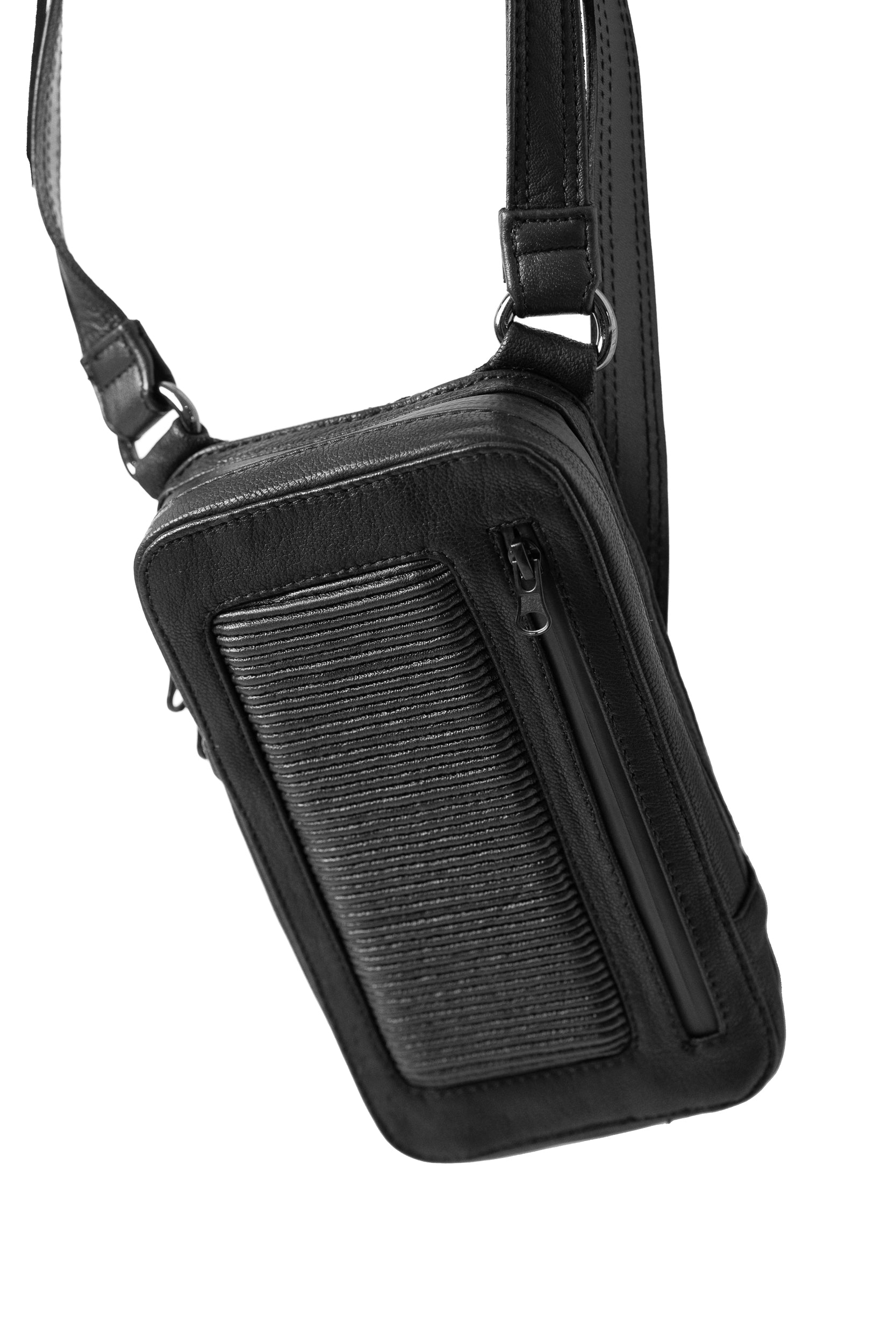 A black leather harness bag with dual pouches and adjustable straps, designed in a holster style.