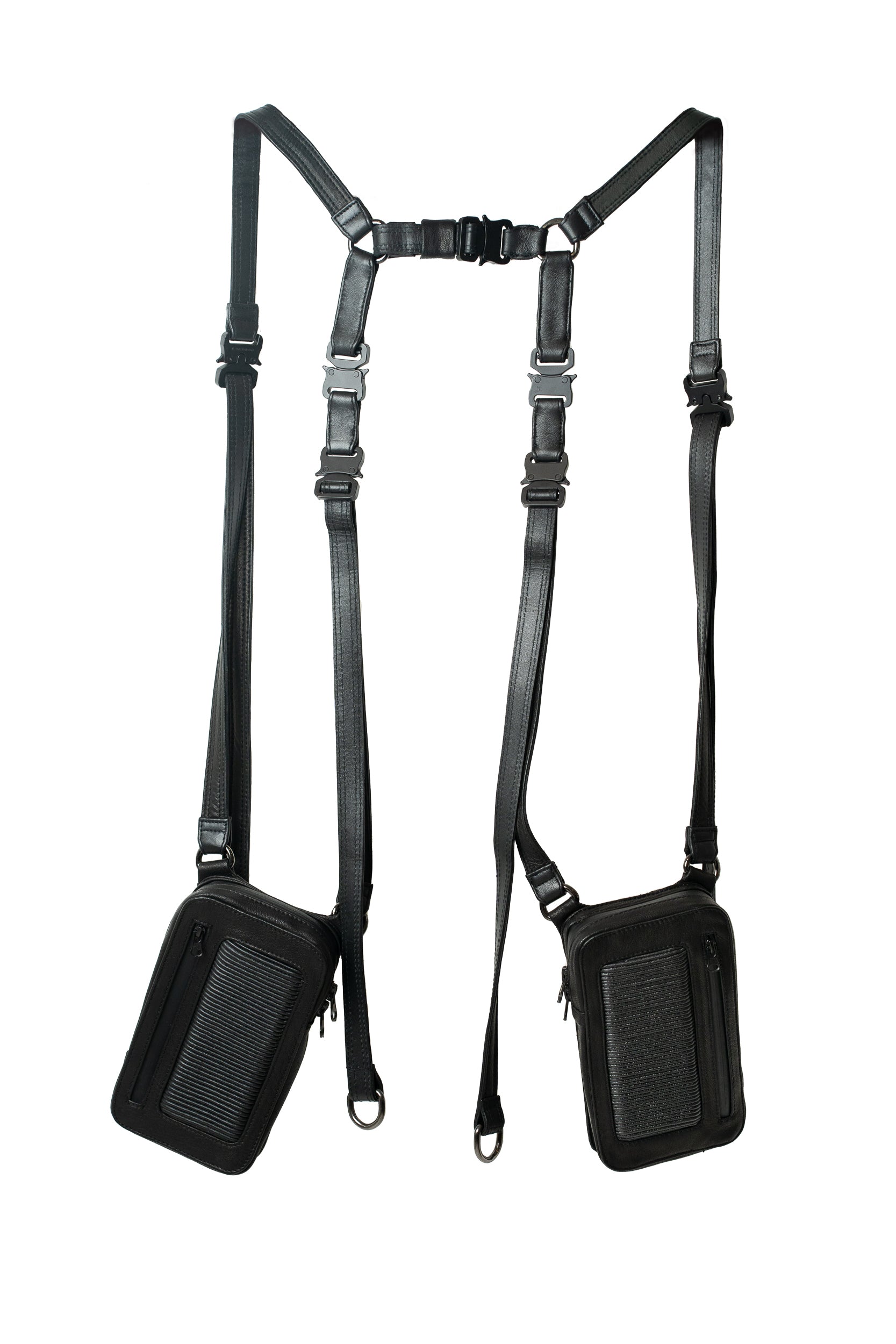 This harness bag can be worn like a vest over the shoulders, or each pouch can be used separately. Both pouches connect at the back with a detachable buckle for customizable wear.