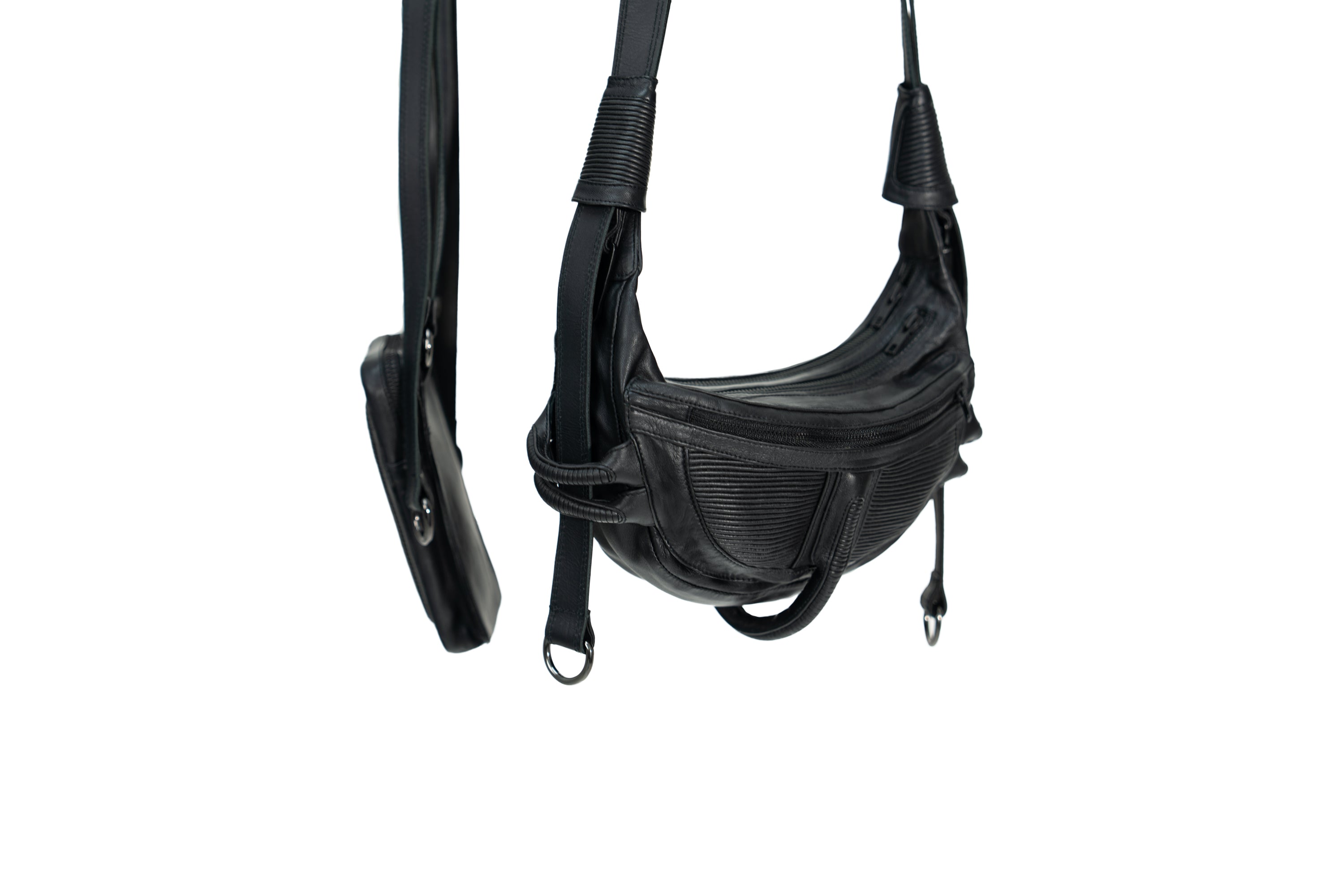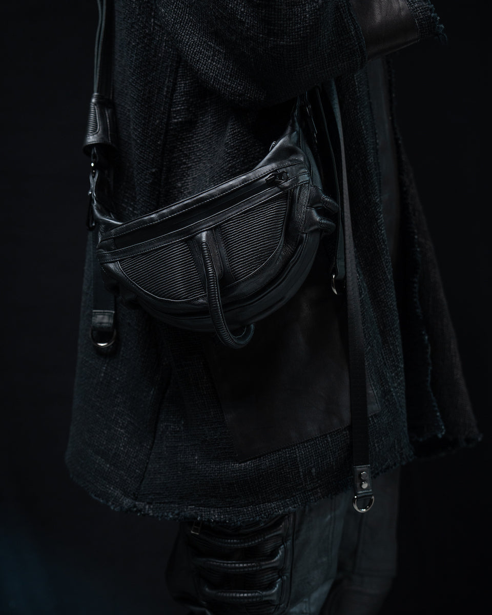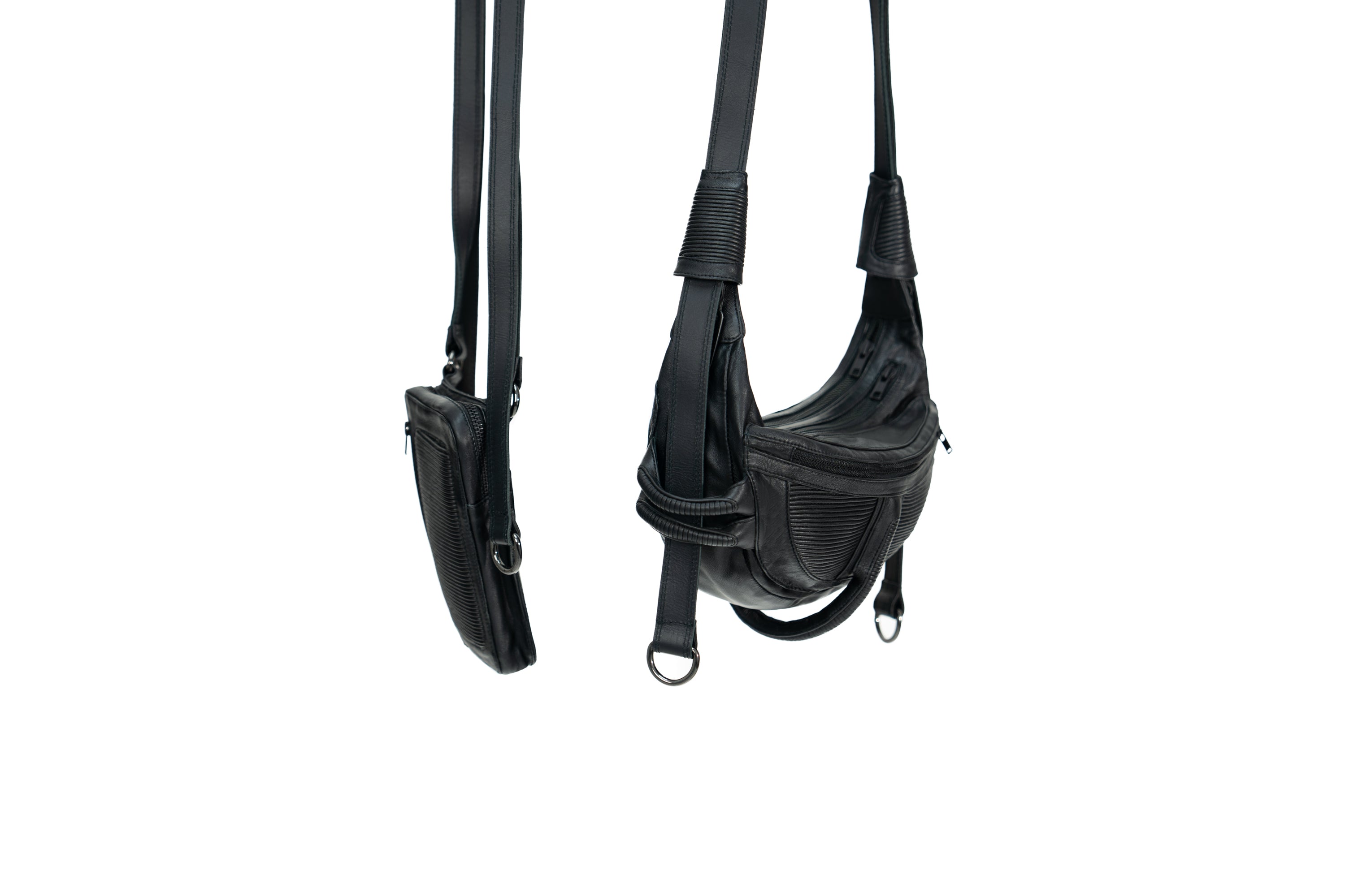 A cutting-edge, futuristic streetwear accessory with a dual-pouch, holster-style design, featuring bold fly-away straps and intricate biomorphic “alien vein” detailing along the sides. The ribbed front panel pocket offers a striking visual element, while eight strategically placed compartments provide organized storage for all essentials. Designed with fully adjustable straps, this piece contours effortlessly to fit any body type, embodying a dark, post-apocalyptic aesthetic.