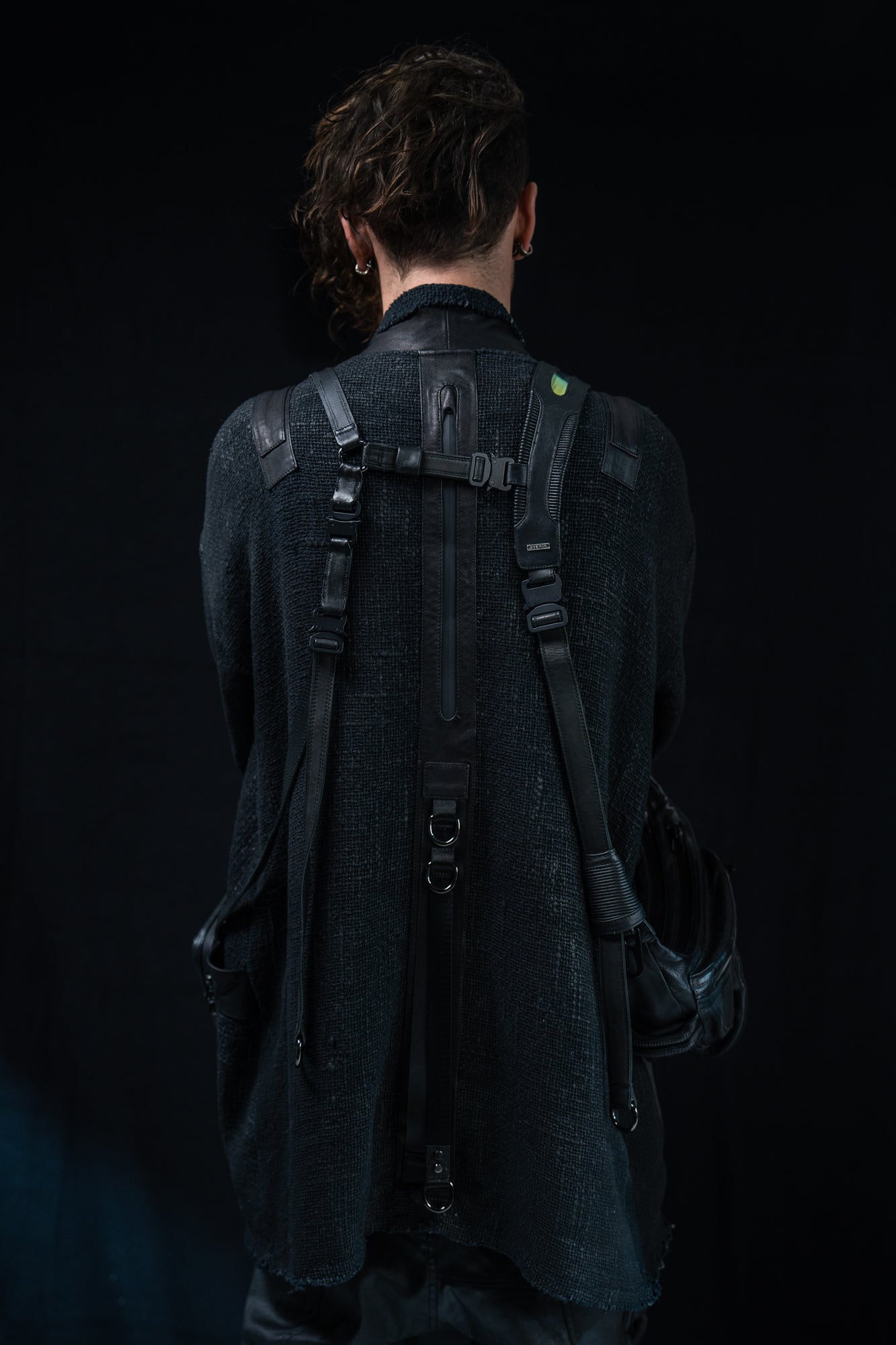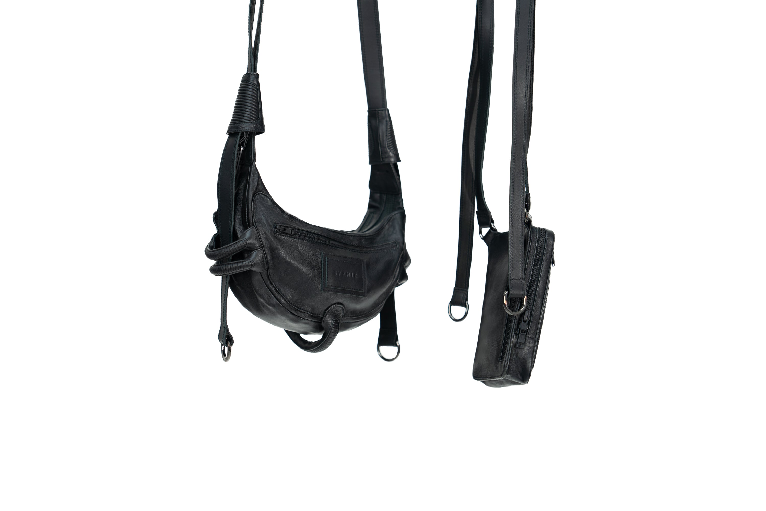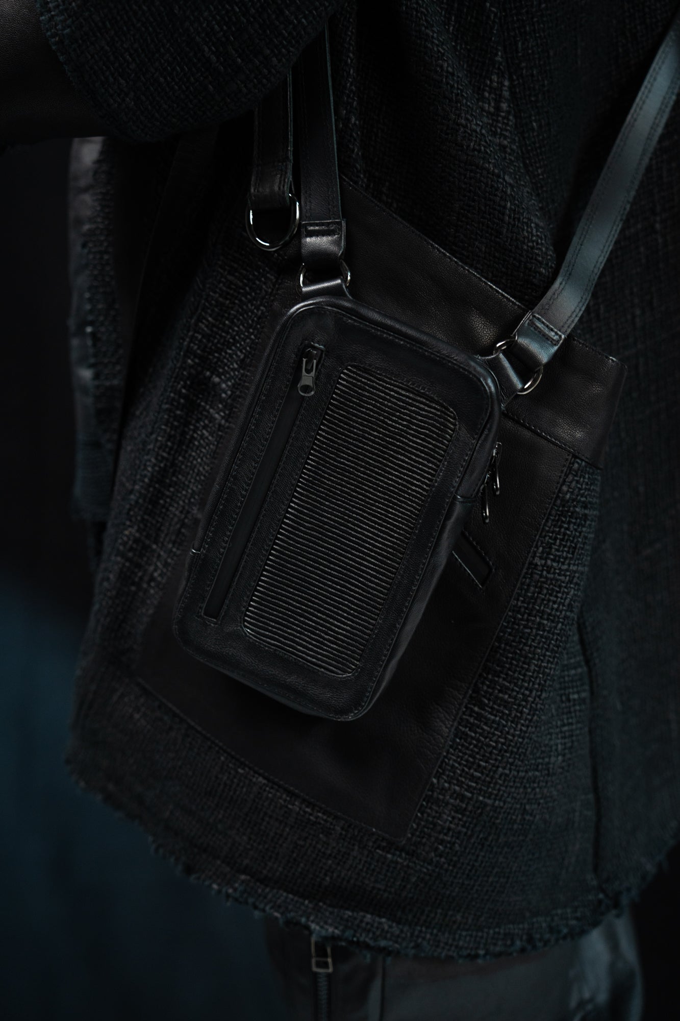 A cutting-edge, futuristic streetwear accessory with a dual-pouch, holster-style design, featuring bold fly-away straps and intricate biomorphic “alien vein” detailing along the sides. The ribbed front panel pocket offers a striking visual element, while eight strategically placed compartments provide organized storage for all essentials. Designed with fully adjustable straps, this piece contours effortlessly to fit any body type, embodying a dark, post-apocalyptic aesthetic.
