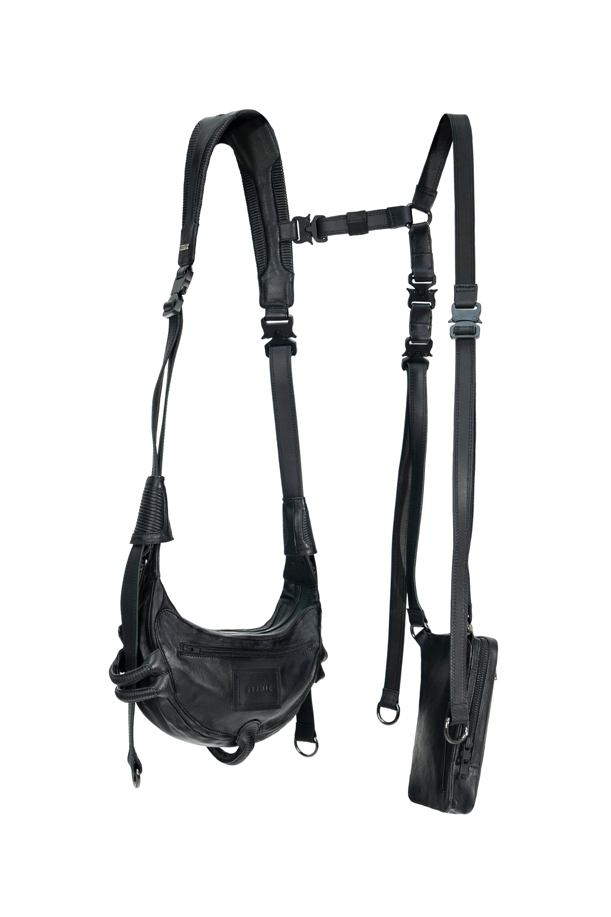 This harness bag can be worn like a vest over the shoulders, or each pouch can be used separately. Both pouches connect at the back with a detachable buckle for customizable wear.