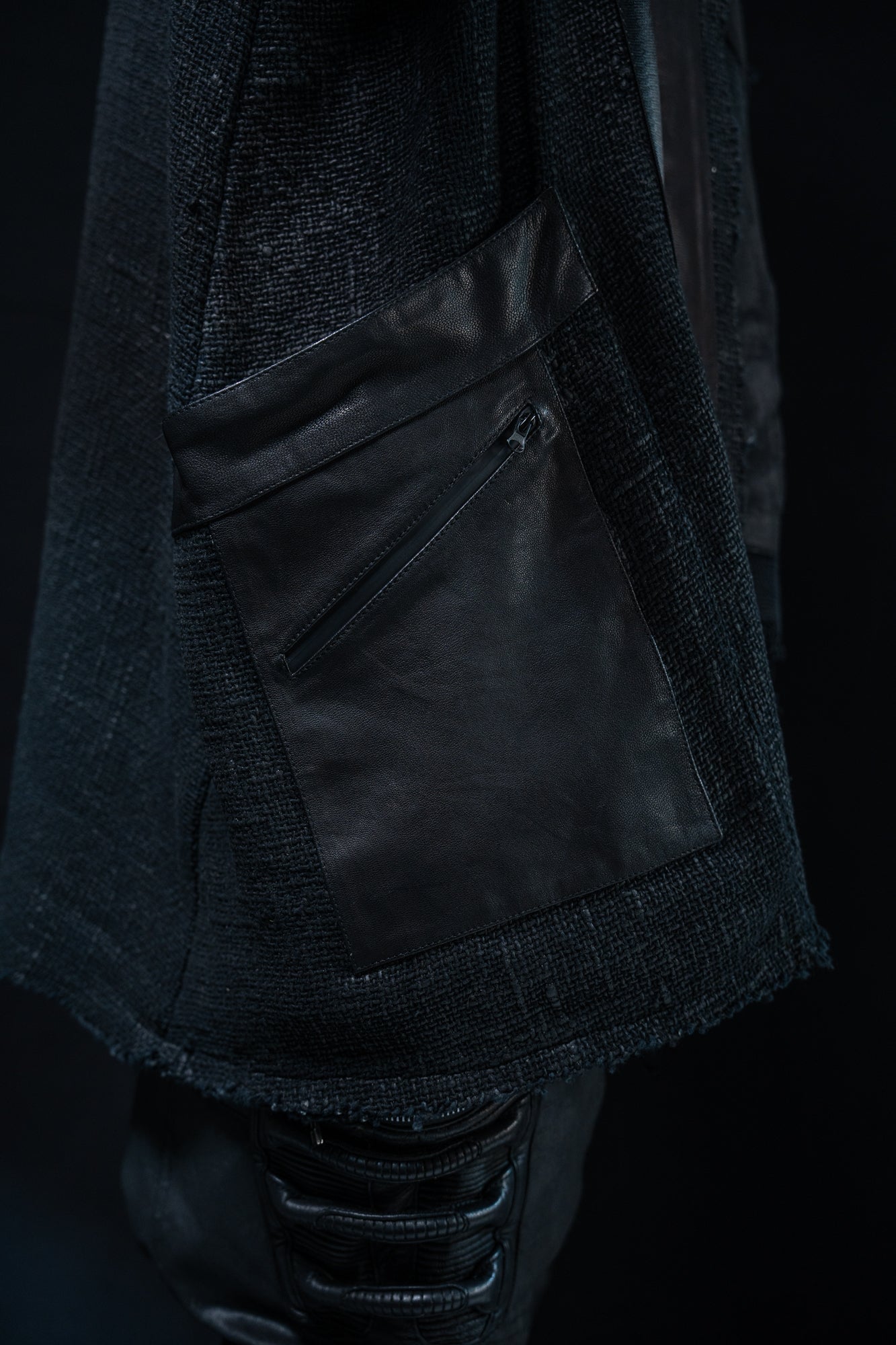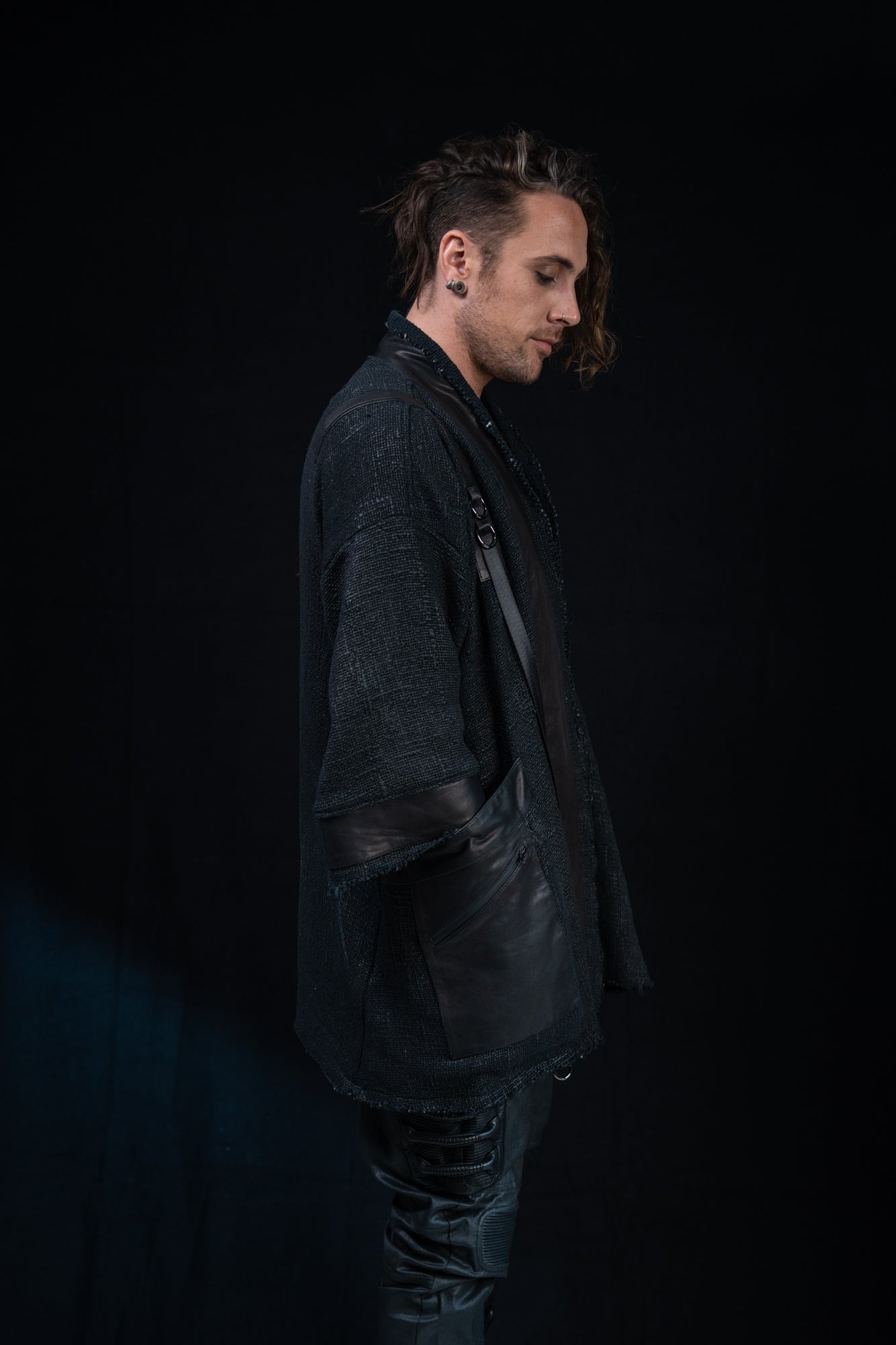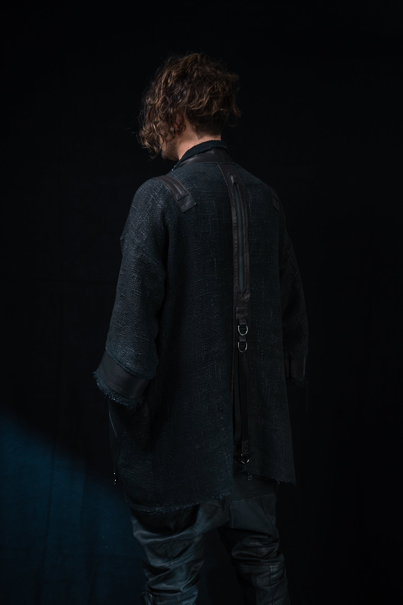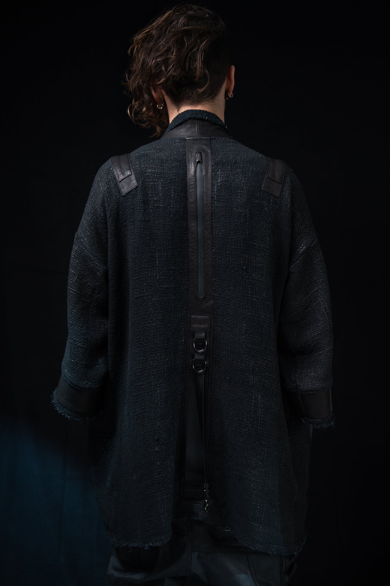 Thick mesh kimono jacket with grunge waxed texture and leather details. Extra large leather pocket with inner zip pocket. Heavyweight fabric keeps you warm.
