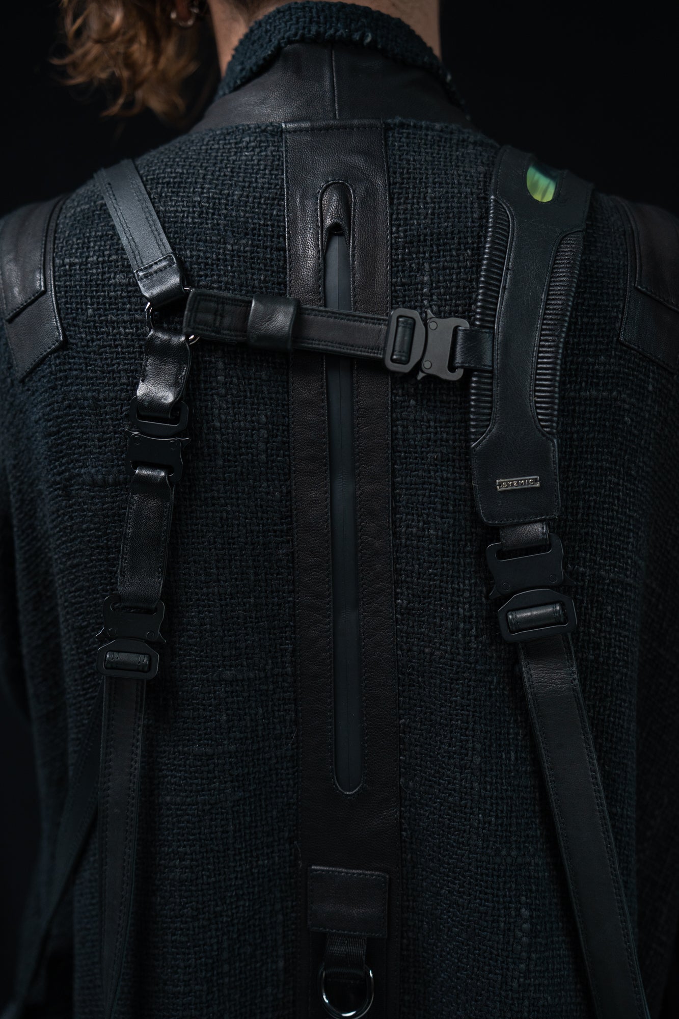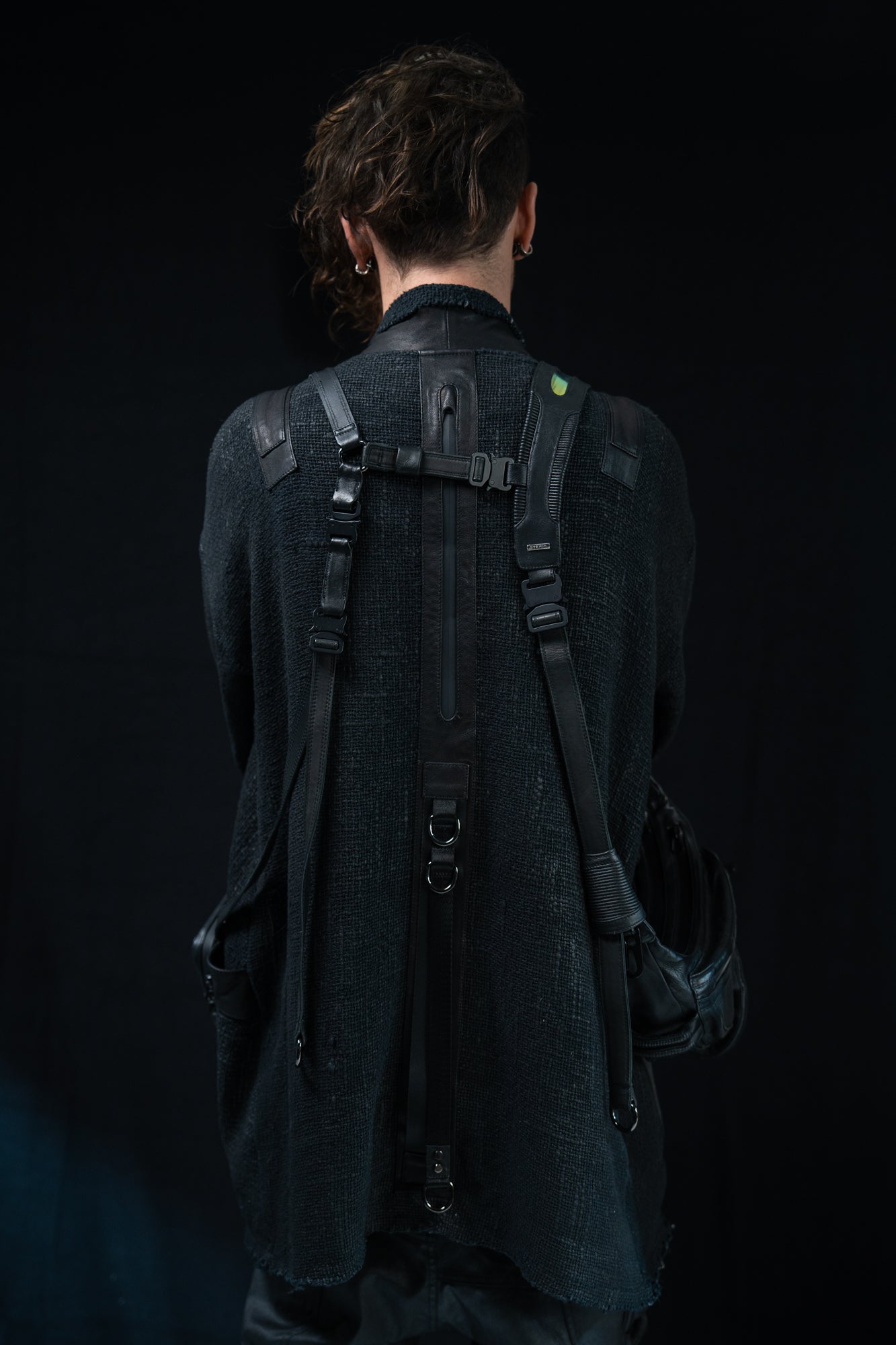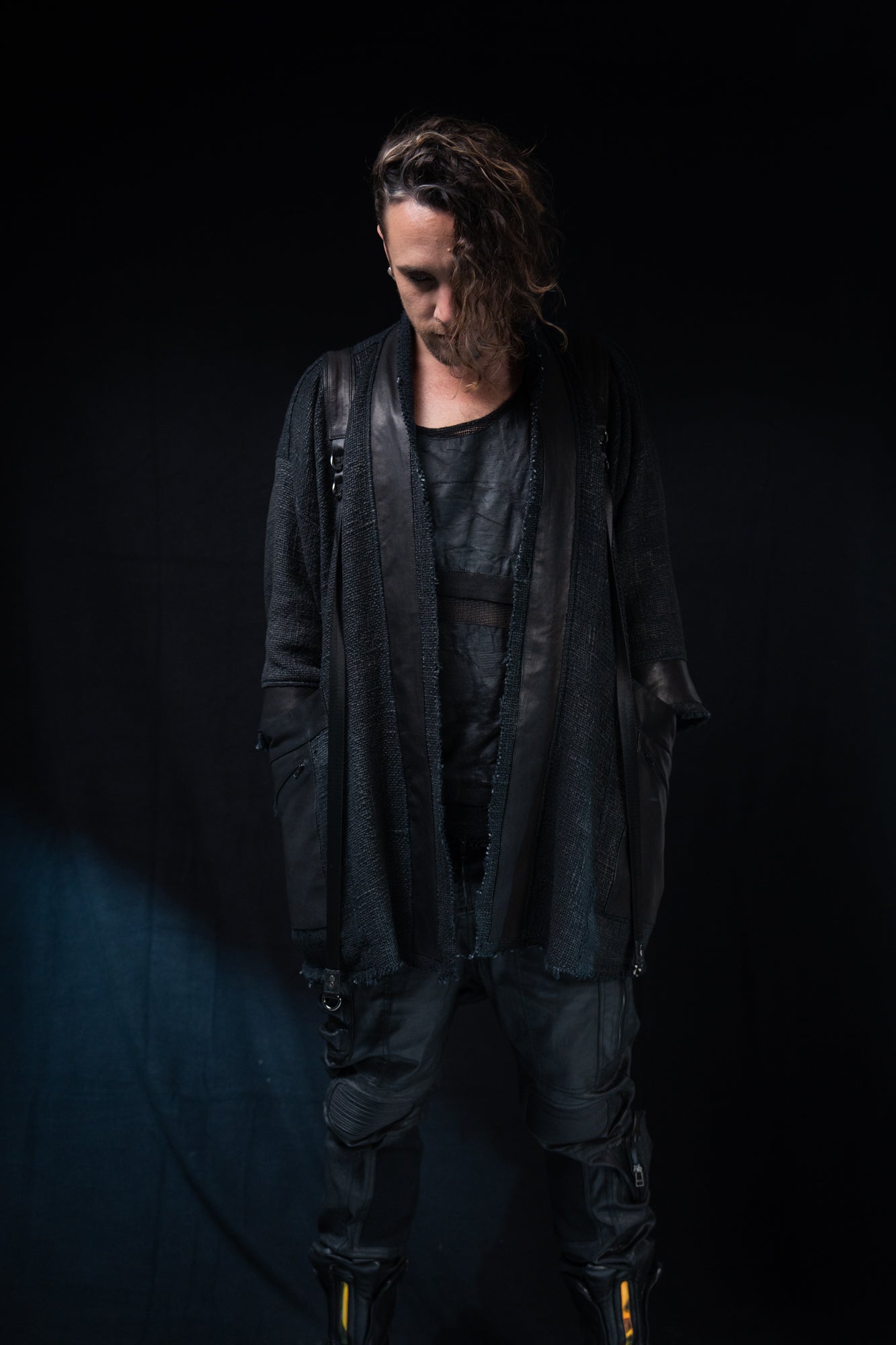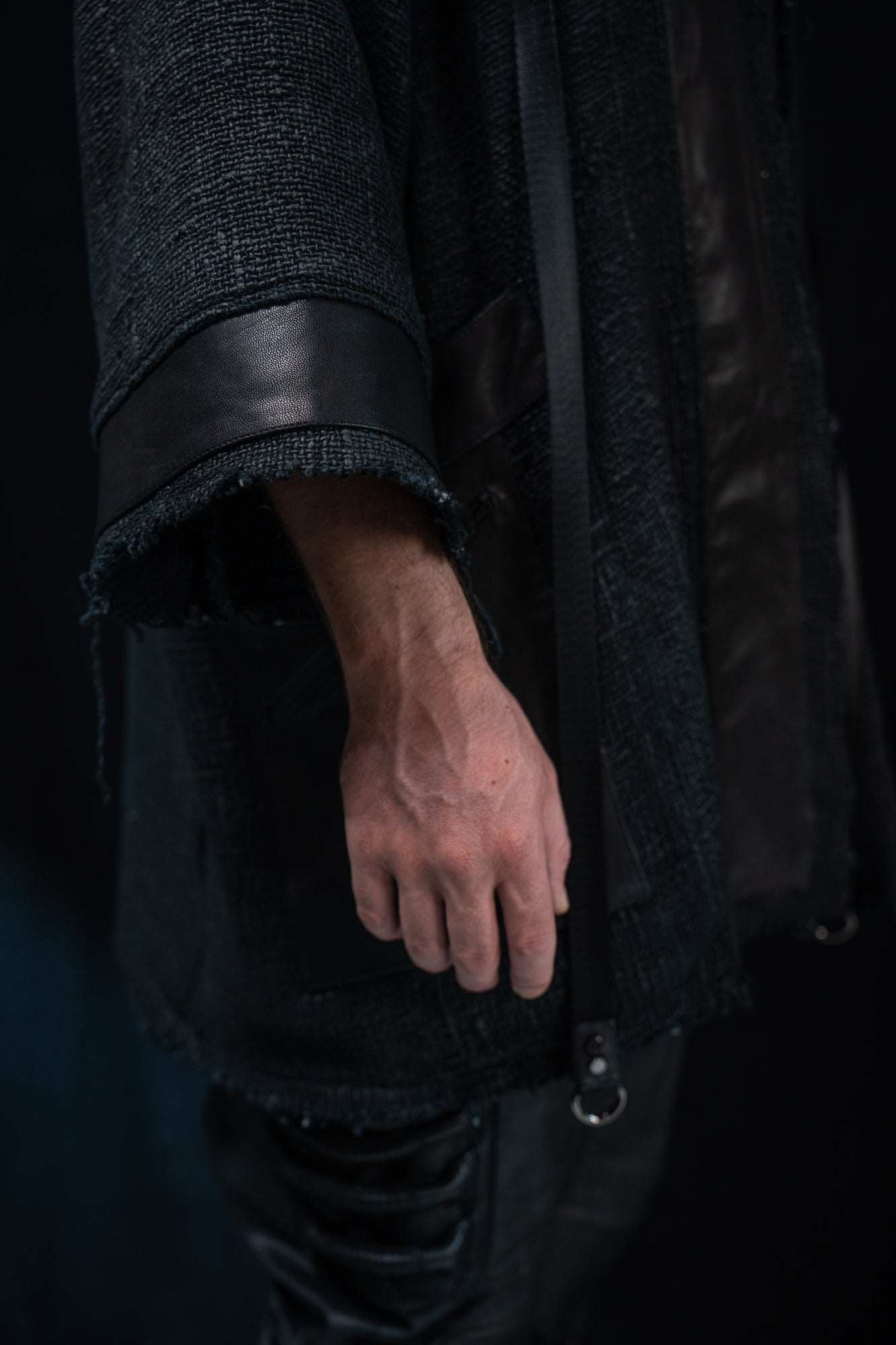 Thick mesh kimono jacket with grunge waxed texture and leather details. Extra large leather pocket with inner zip pocket. Heavyweight fabric keeps you warm.